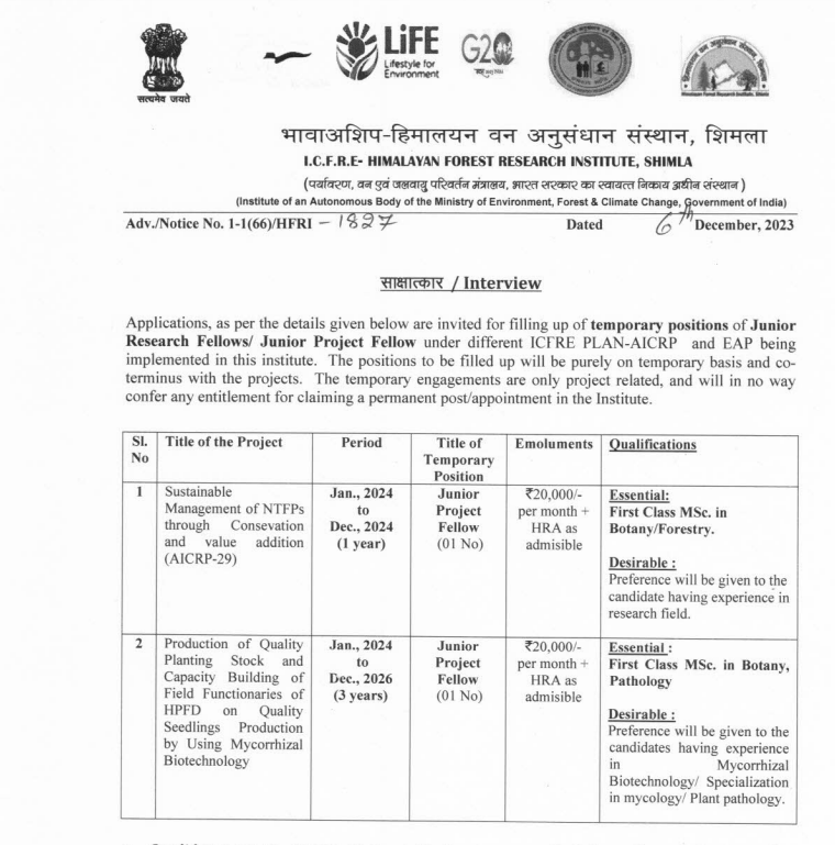 WALK IN INTERVIEW SHIMLA हिमालय वन अनुसंधान संस्थान, पड़े Notification