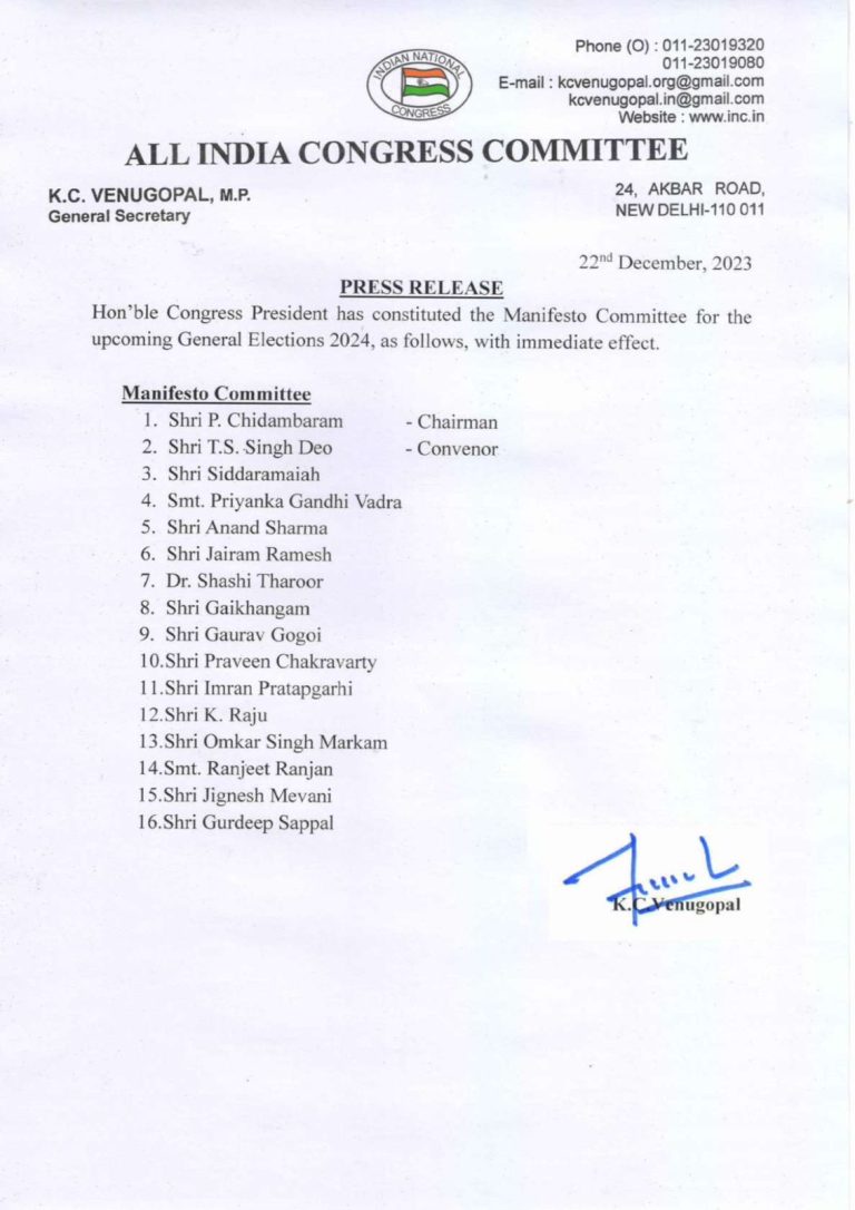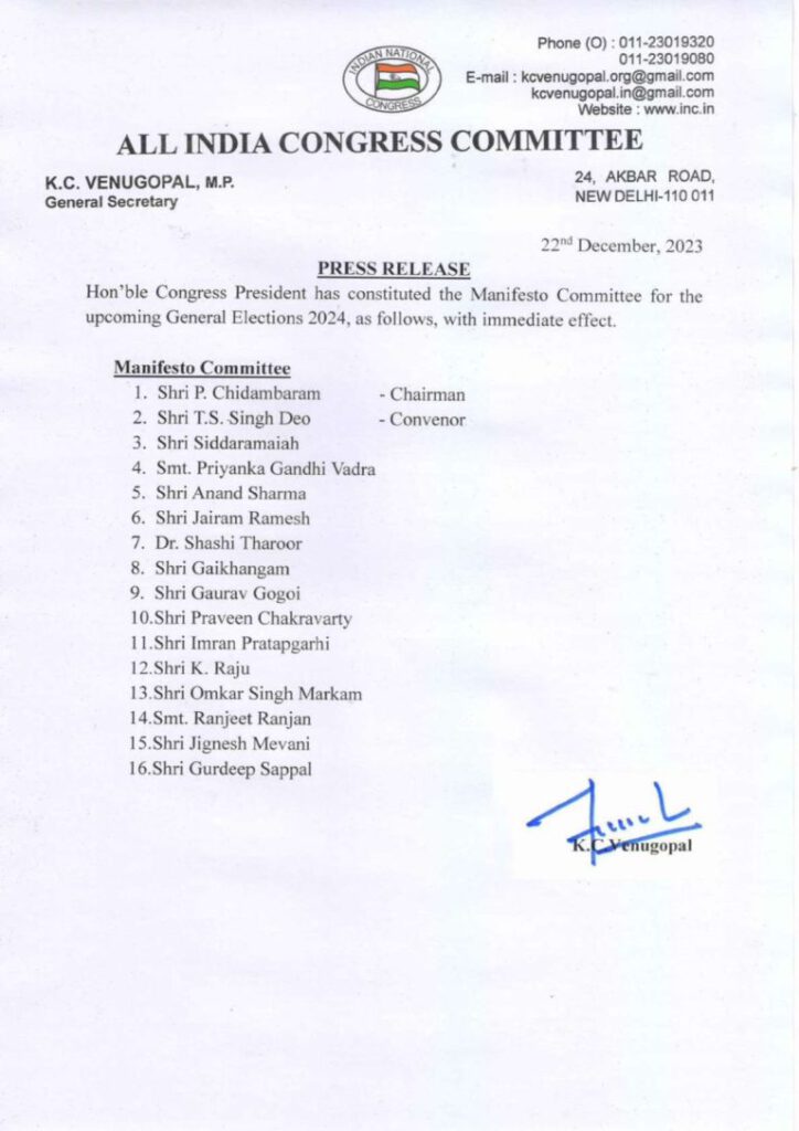 लोकसभा चुनाव के लिए कांग्रेस पार्टी ने बनाई मेनिफेस्टो कमेटी पी. चिदंबरम चेयरमैन. इन नेताओं को अहम जिम्मेदारी….
