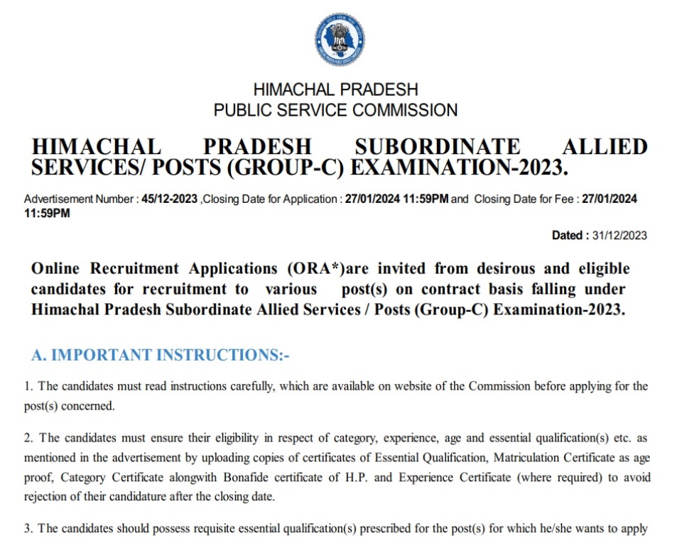 HPPSC Allied Services Recruitment 2024 Notification Out, Check Eligibility, Syllabus, Last Date, Apply Now…..