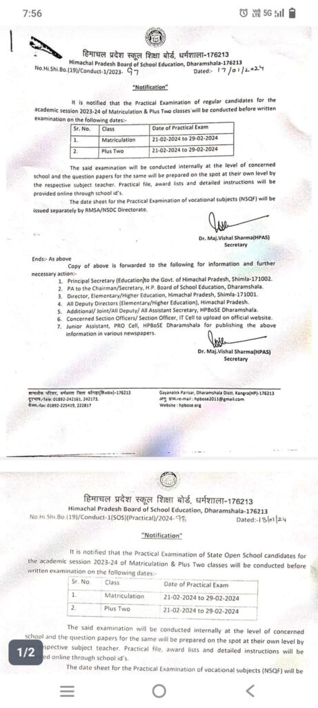 हिमाचल प्रदेश स्कूल शिक्षा बोर्ड द्वारा प्रैक्टिकल डेट शीट जारी…