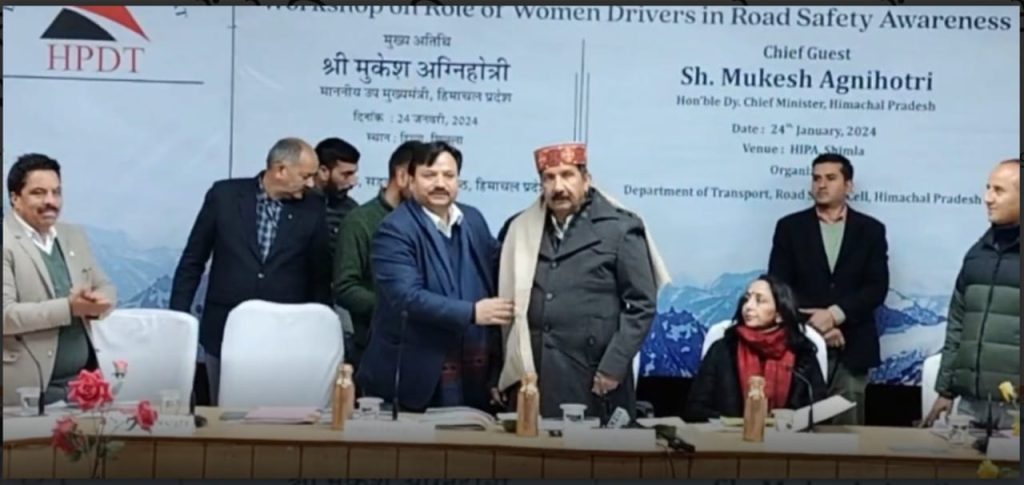 उप-मुख्यमंत्री मुकेश अग्निहोत्री ने आज यहां परिवहन विभाग द्वारा सड़क सुरक्षा अभियान के अंतर्गत आयोजित कार्यशाला की अध्यक्षता की। सड़क सुरक्षा जागरूकता में महिलाओं की भागीदारी सुनिश्चित करने के दृष्टिगत यह कार्यशाला आयोजित की गई।इस अवसर पर उप-मुख्यमंत्री ने कहा कि महिलाएं आज स्वावलम्बन और आत्मनिर्भरता की ओर आगे बढ़ रही हैं। प्रदेश में लगभग एक लाख 10 हजार से ज्यादा महिला वाहन चालक हैं। महिलाएं इस तरह के जागरूकता अभियान को प्रभावी ढंग से जन-जन तक पहुंचाने में अपनी सार्थक भूमिका निभा सकती हैं।