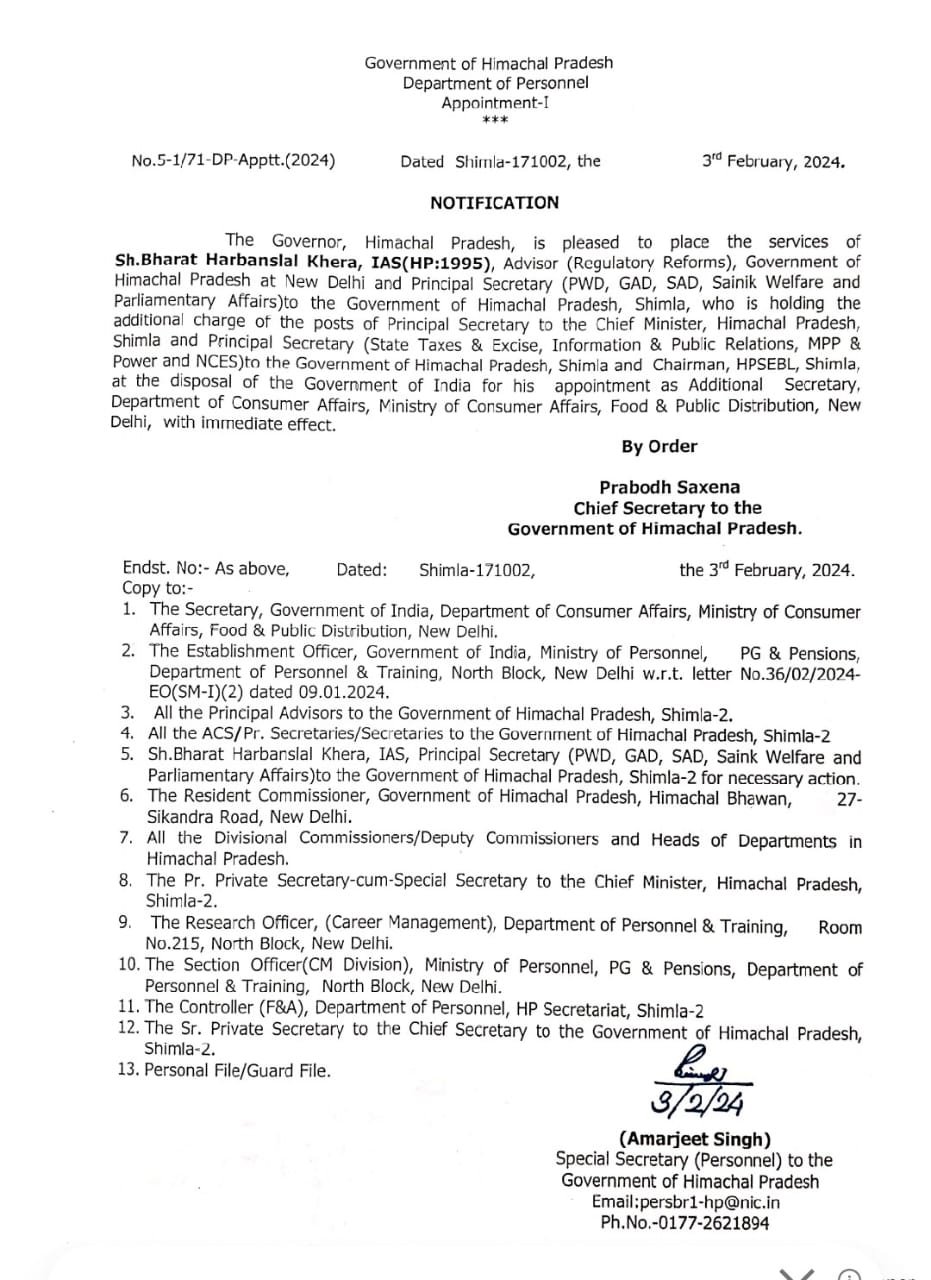 IAS भरत खेड़ा जायेंगे दिल्ली, कौन होगा मुख्यमंत्री का प्रधान सचिव? अधिसूचना देखें…….