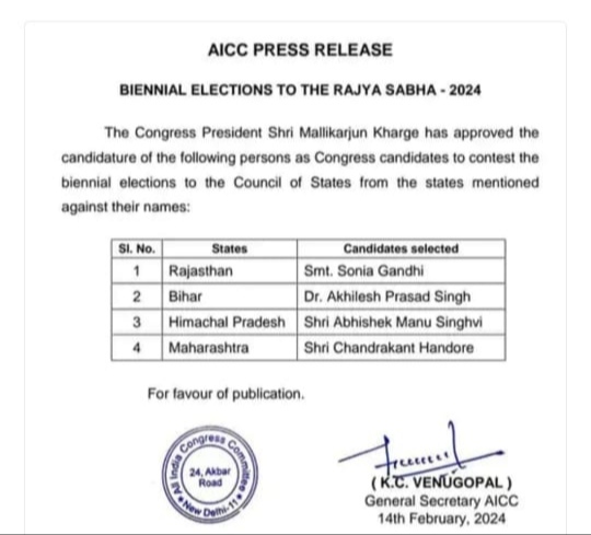 कांग्रेस ने राज्यसभा के लिए जारी की सूची, हिमाचल से अभिषेक मनु सिंघवी भरेंगे नामांकन……