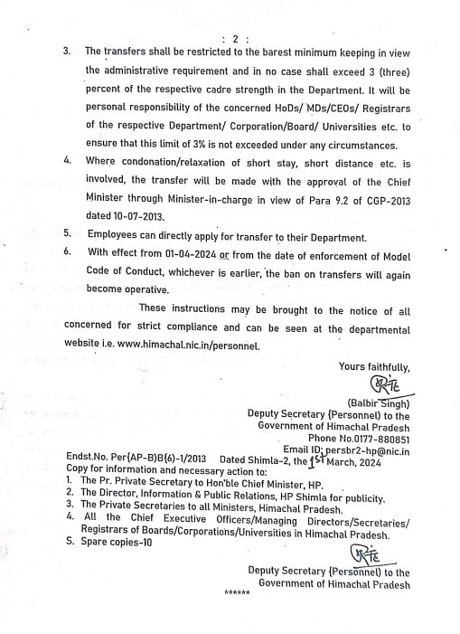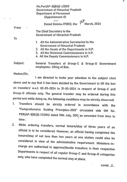 हिमाचल में कर्मचारियों के तबादलों से हटा प्रतिबंध… Read Notification….