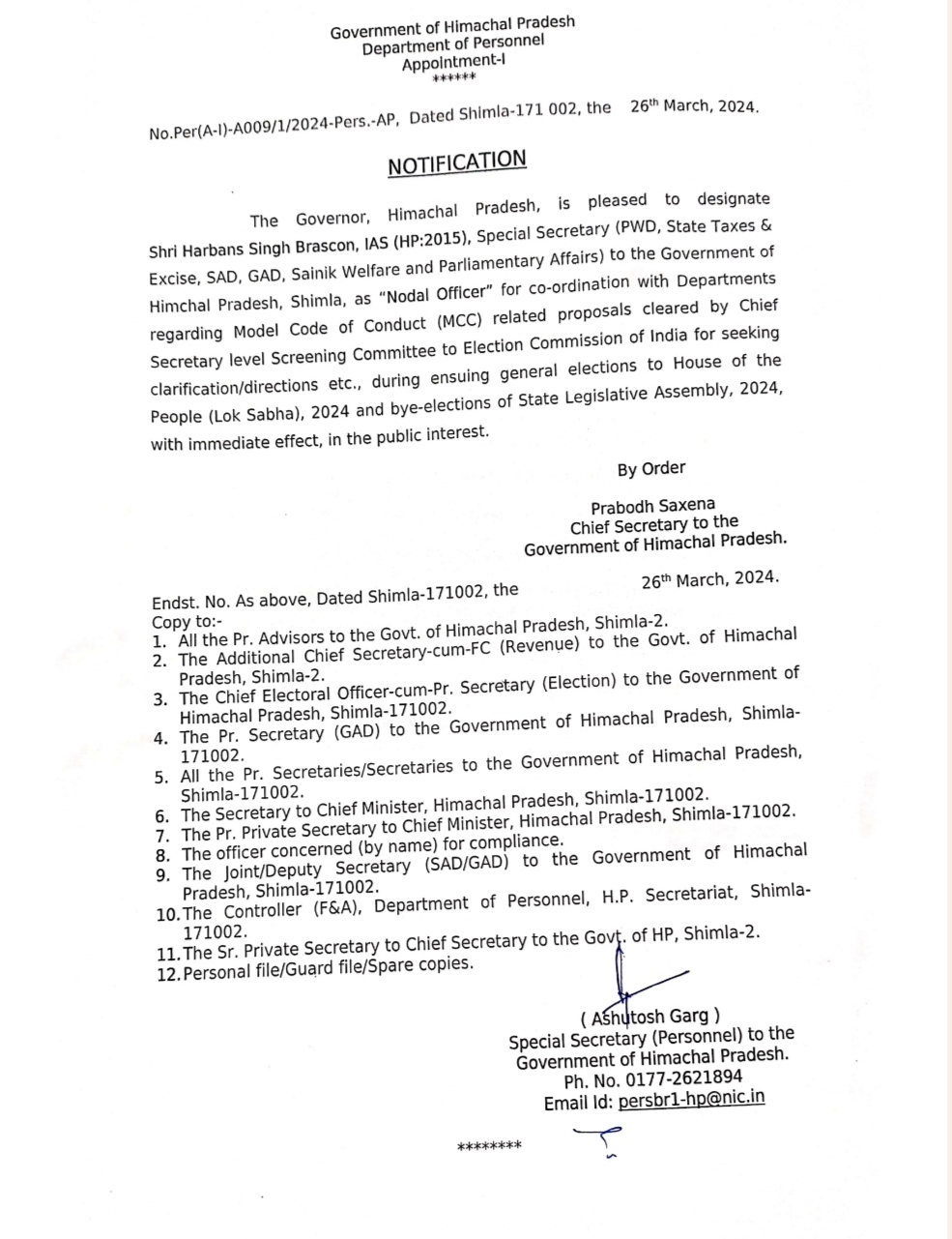 IAS हरबंस सिंह बरस्कान को बनाया MCC का नोडल ऑफिसर….