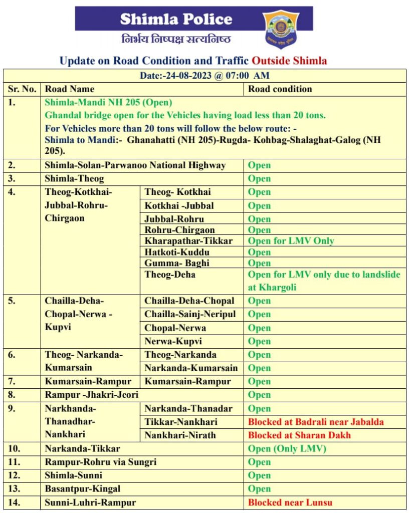 शिमला से कौन सी सड़कें खुली कौन सी बन्द देखे 24 August 7, शिमला- चंडीगढ़ NH भी खुला…