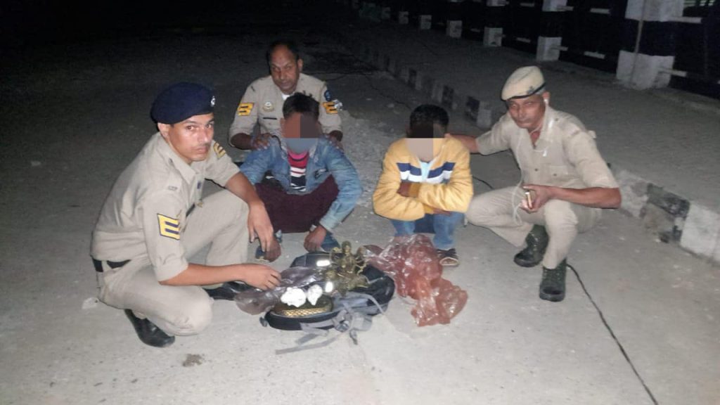 दिनांक 29.08.2023 को पुलिस थाना सदर कुल्लू की टीम ने रात्री गश्त के दौरान भूतनाथ पुल फोरलेन सड़क में दो नेपाली नागरिकों क्रमश: सीलीक तमंग पुत्र पेमा रिछेन तमंग निवासी गुंसा वार्ड न0 2 तह0 चौतारा जिला सिंधुपाल चौक आंचल बागमती नेपाल उम्र 42 वर्ष व विष्णु गोशाल पुत्र भारत गोशाल निवासी वीरगंज तह0 बाराहा जिला आंचल बागमती नेपाल उम्र 33 वर्ष के कब्जे से चोरीशुदा एक धातु की मूर्ति तथा दो शंख बरामद किया है। इस संदर्भ में एक अभियोग अंतर्गत धारा 380,34 भाo दo सo पुलिस थाना कुल्लू में पंजीकृत हुआ है। गहन पूछताछ में गिरफतार आरोपियों ने यह बतलाया कि बरामद किया गया समान (मूर्ति व शंख) इन्होंने जिला जिला लाहौल स्पीति से चोरी किया है। आगामी अन्वेषण जारी है
